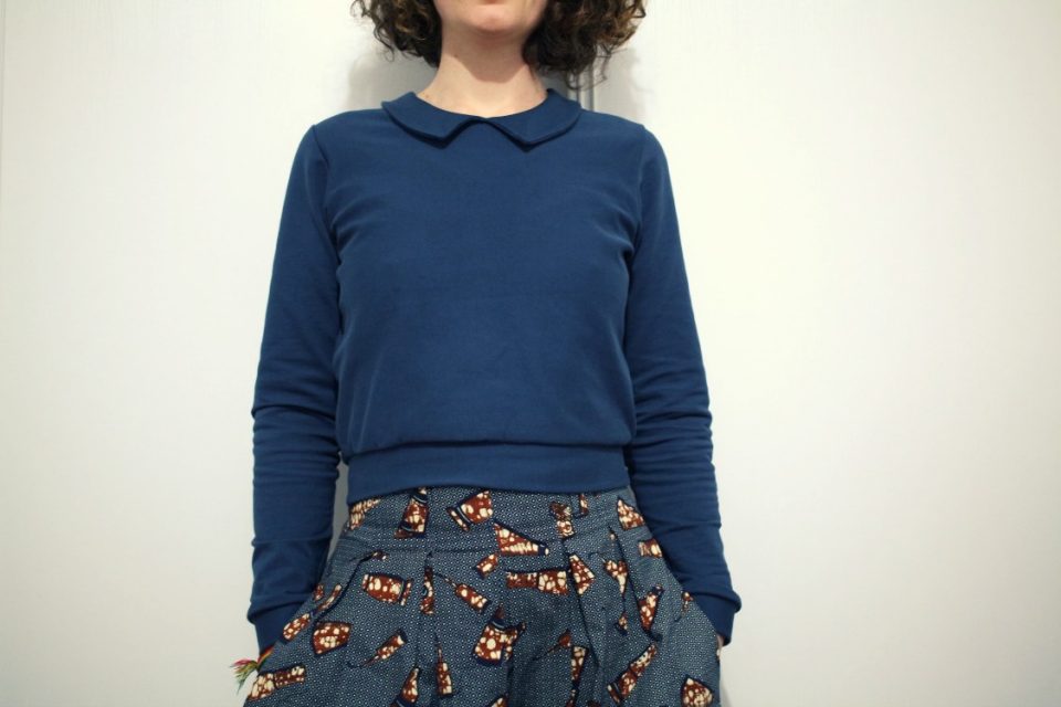 Super contente de ma jupe, j’étais un peu embêté pour la porter car je n’avais que des hauts trop léger pour l’hiver à mettre avec. Je lui ai donc cousu un compagnon de tenue, taillé pour puisqu’il s’agit du sweat Ondée ! Mon 2ème aussi. Je l’ai rallongé un peu mais j’aurai du aussi l’élargir un peu en bas car il a tendance à remonter un petit peu trop.