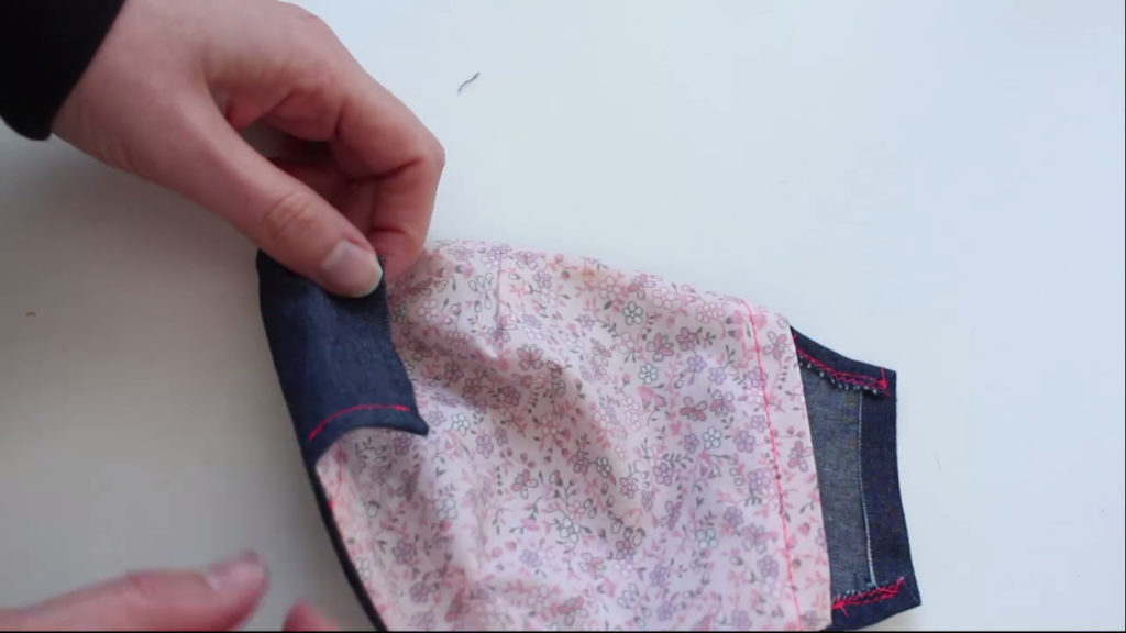 9/ Retournez le masque ; repassez le en prenant soin de replier le haut et le bas du coté extérieur qui dépasse de la doublure.